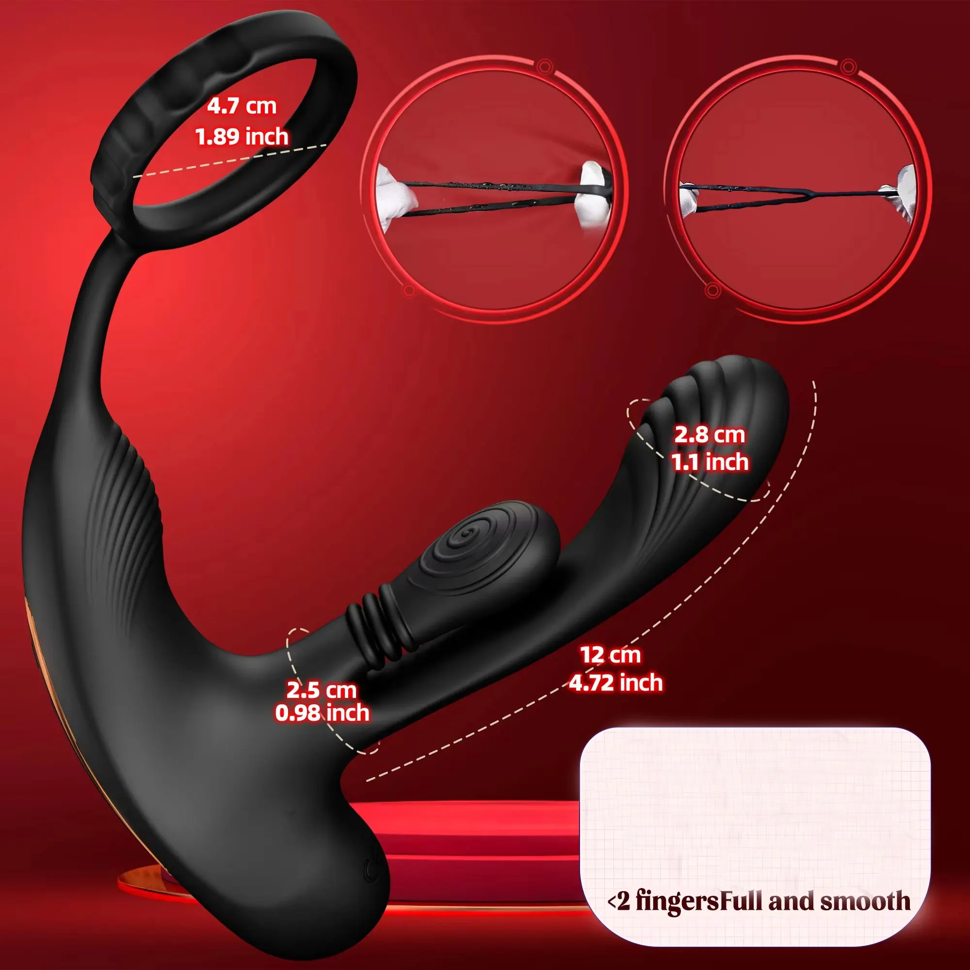 The curved shaft is shaped to naturally align with the body, targeting sensitive internal areas while the external ring enhances overall sensation. The textured base also provides additional perineum stimulation.