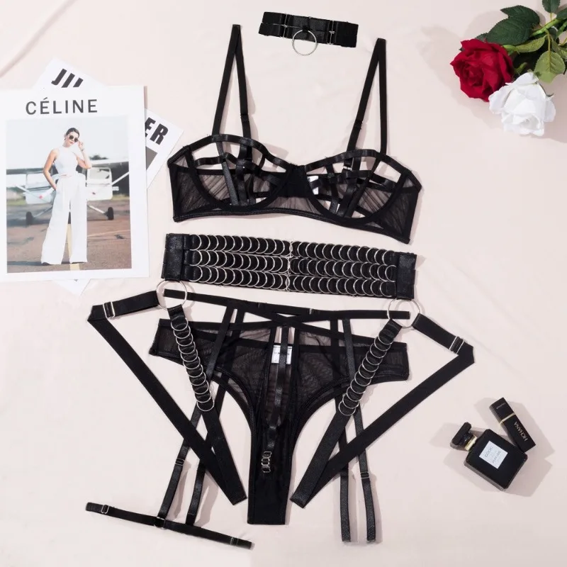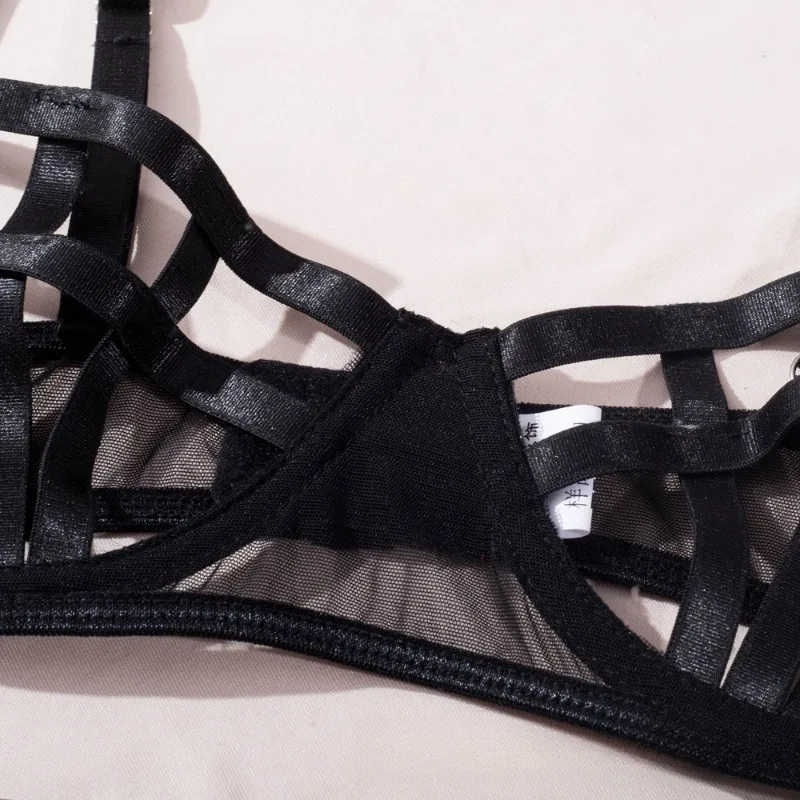 • hollow out underwear set with strap detail    supportive strap lingerie close up  split design lingerie side angle  solid color underwear set full look  bold strap styling on lingerie set lightweight lingerie fabric texture  thin polyester blend lingerie detail