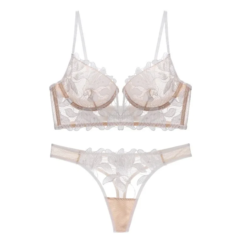 embroidered lace underwear set detailpush up bra and G-string setromantic embroidered lingerie set side anglelace embroidery lingerie set close uptwo piece lace lingerie set for womenultra-thin bra detail with embroiderymatching G-string underwear close upsolid color lingerie set full lookembroidered bra cup detailside profile of two piece underwear setfeminine lace underwear styling